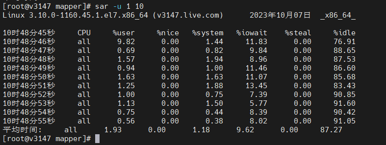 使用sar -u 1 10 查看CPU资源监控