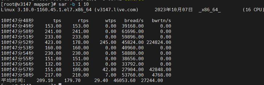 再使用sar -b 10 3 查看读写情况