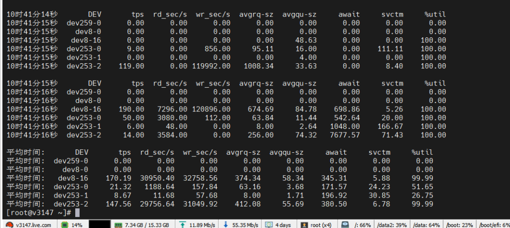 使用命令 sar -d 1 10 一秒钟采样10次系统设备使用情况,发现有多个磁盘使用率100%