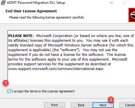 接受许可证1,然后单击“下一步2”。