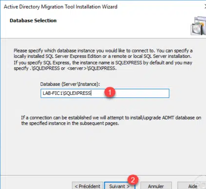 输入SQL Server实例信息1,然后单击Next 2。