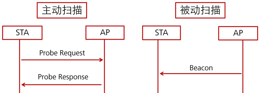 被动扫描:STA被动等待AP每隔一段时间定时送出的Beacon信标帧,该帧提供了AP及所在BSS相关信息