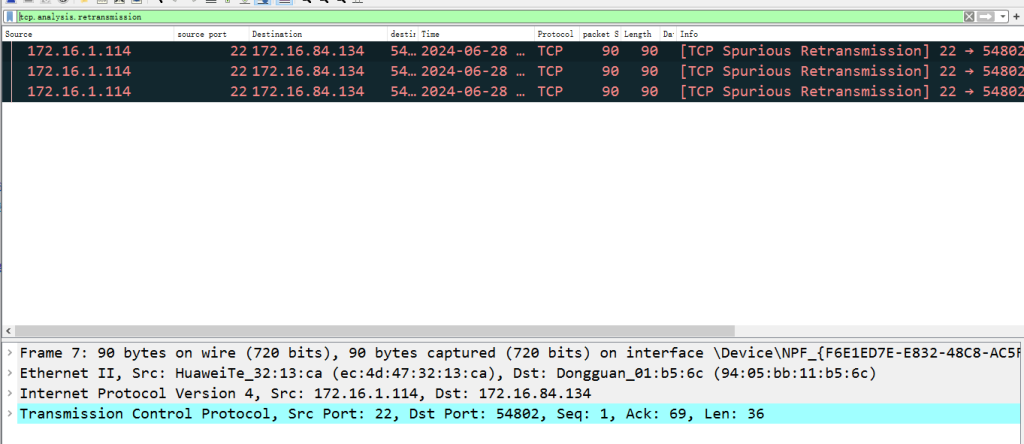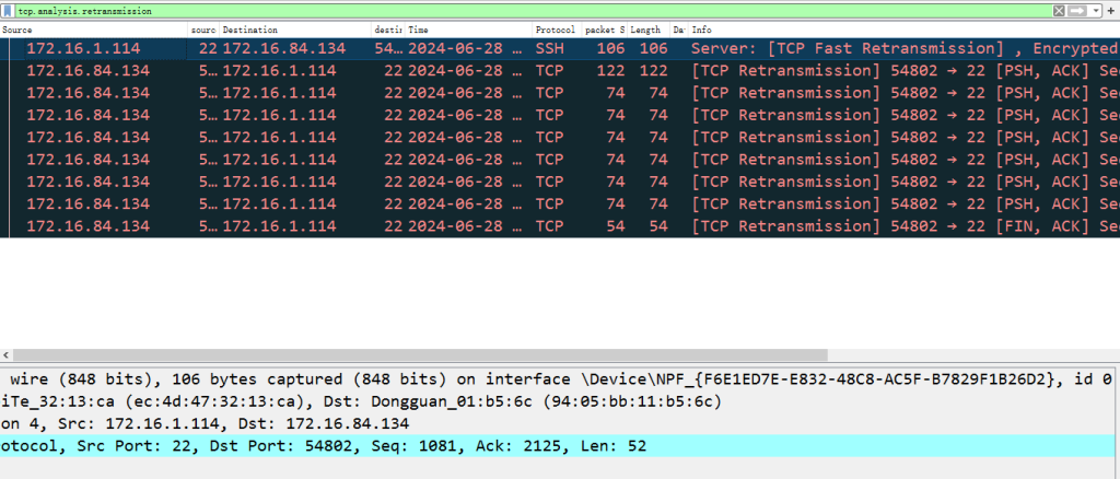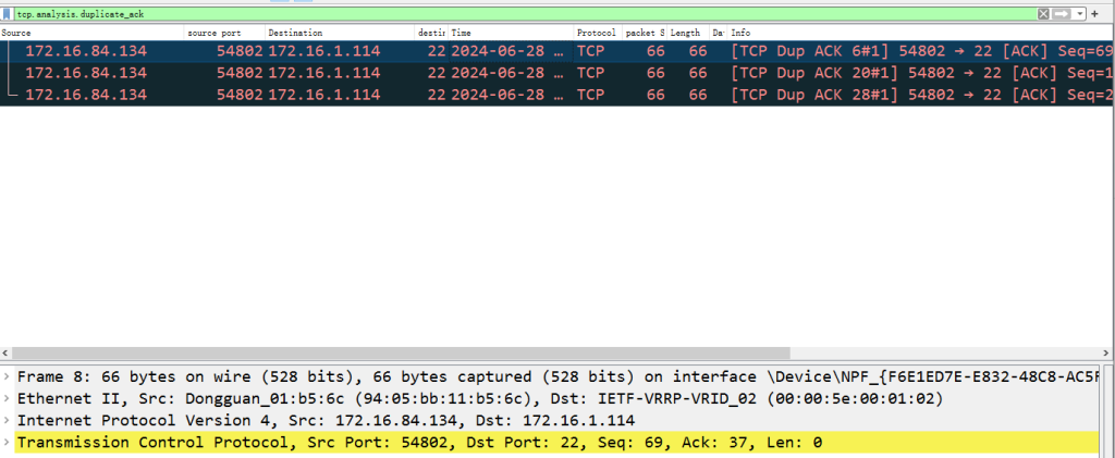 通过网络抓包:通过使用tcpdump命令进行抓包,使用wireshark中观察tcp中是否存在大量的重复ACK包和重传数据包,过滤器为:tcp.analysis.duplicate_ack 或 tcp.analysis.retransmission