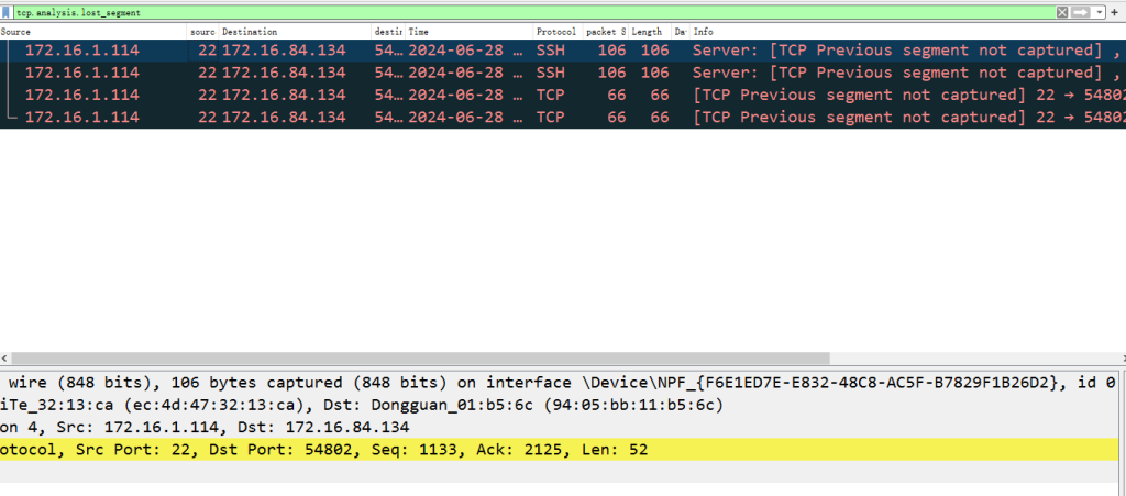 使用tcp.analysis.lost_segment来过滤未捕获到的tcp包