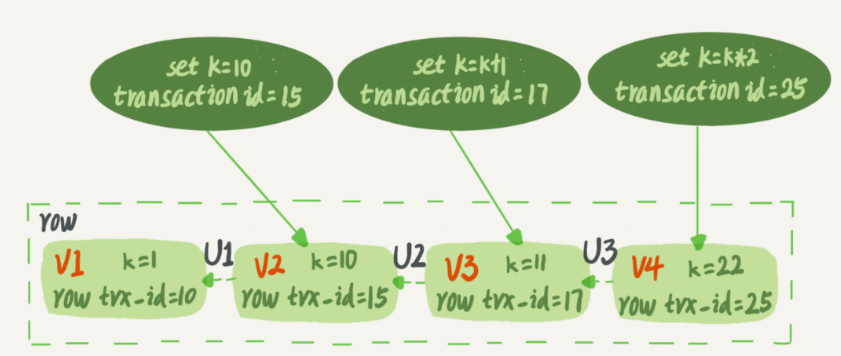 - 上图中虚线框里是同一行数据的 4 个版本,当前最新版本是V4,k的值是22,它是被 transaction id 为 25 的事务更新的,因此它的 row trx_id 也是 25。