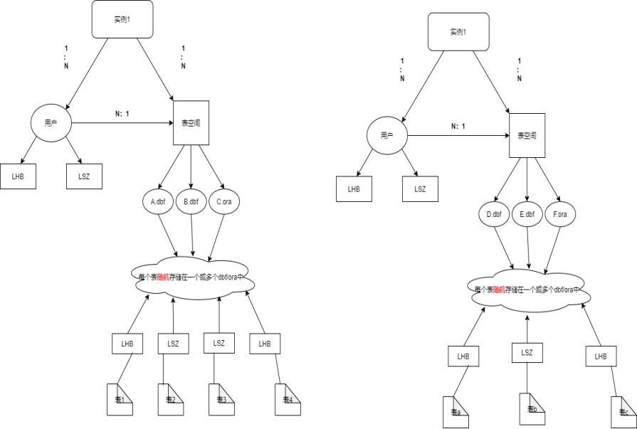 - 表空间:通过表空间存储物理表,一个数据库实例存储N个表空间,一个表空间存储N个表,可以有N个数据文件;