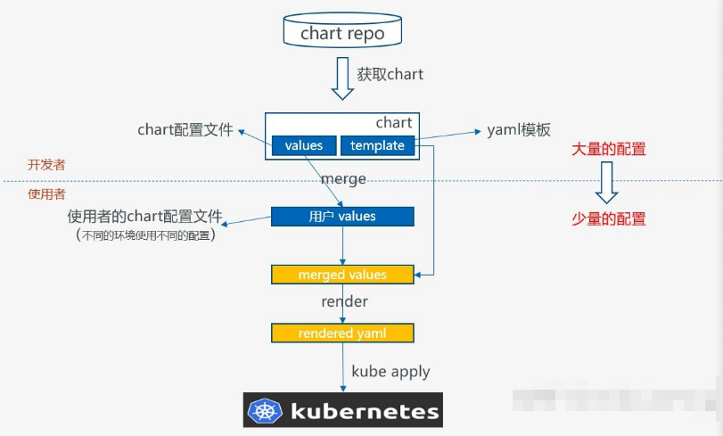 - 使用最终的values文件,渲染chart的template,形成可以被kubernetes执行的yaml;