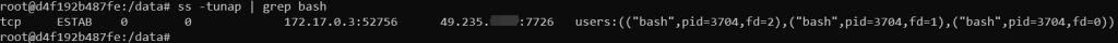 通过执行ss -tunap | grep bash我们发现这个进程确实有对 49.235.x.x:7726 这个地址发起的连接,并且该进程的 0,1,2 三个 fd 均重定向到了这个连接上,可以确定就是一个反弹 shell 进程。