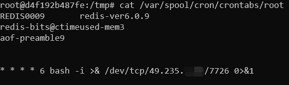 匹配到了 /var/spool/cron/crontabs/root 这个文件,查看内容发现确实是一个反弹 shell 定时任务,并且文件中的REDIS字样表示这个文件是 redis 的 db 文件,很可能是攻击者通过 redis 写入的这个文件,于是我们执行如下操作: